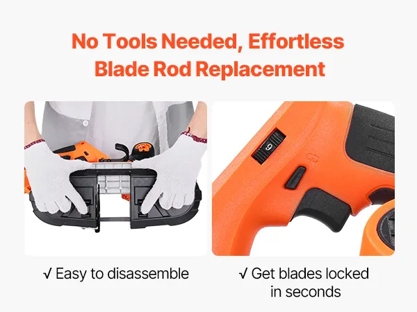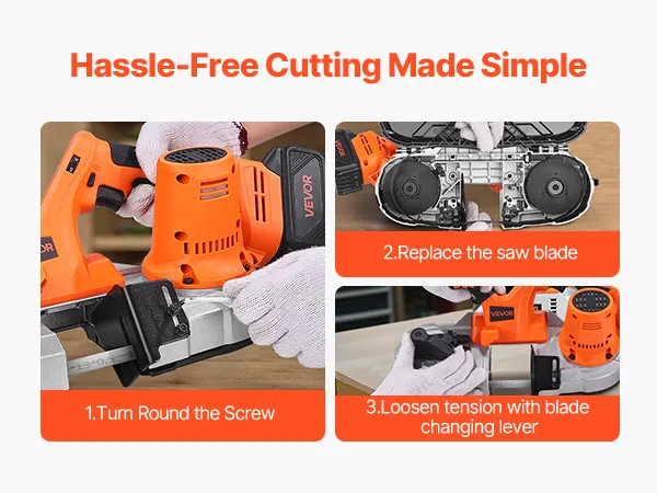 Zaagbladen wisselen in enkele seconden. Gewoon aan de schroef draaien en klaar. Deze draagbare lintzaag wordt geleverd met een handige zaagbladsleutel, dus er is geen extra gereedschap nodig. Snelle zaagbladwissels betekenen minder stilstand en meer tijd om te zagen.