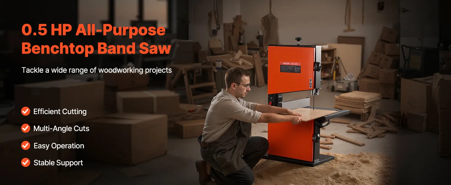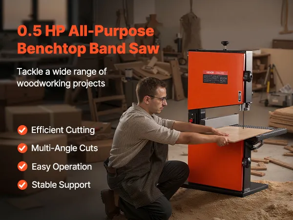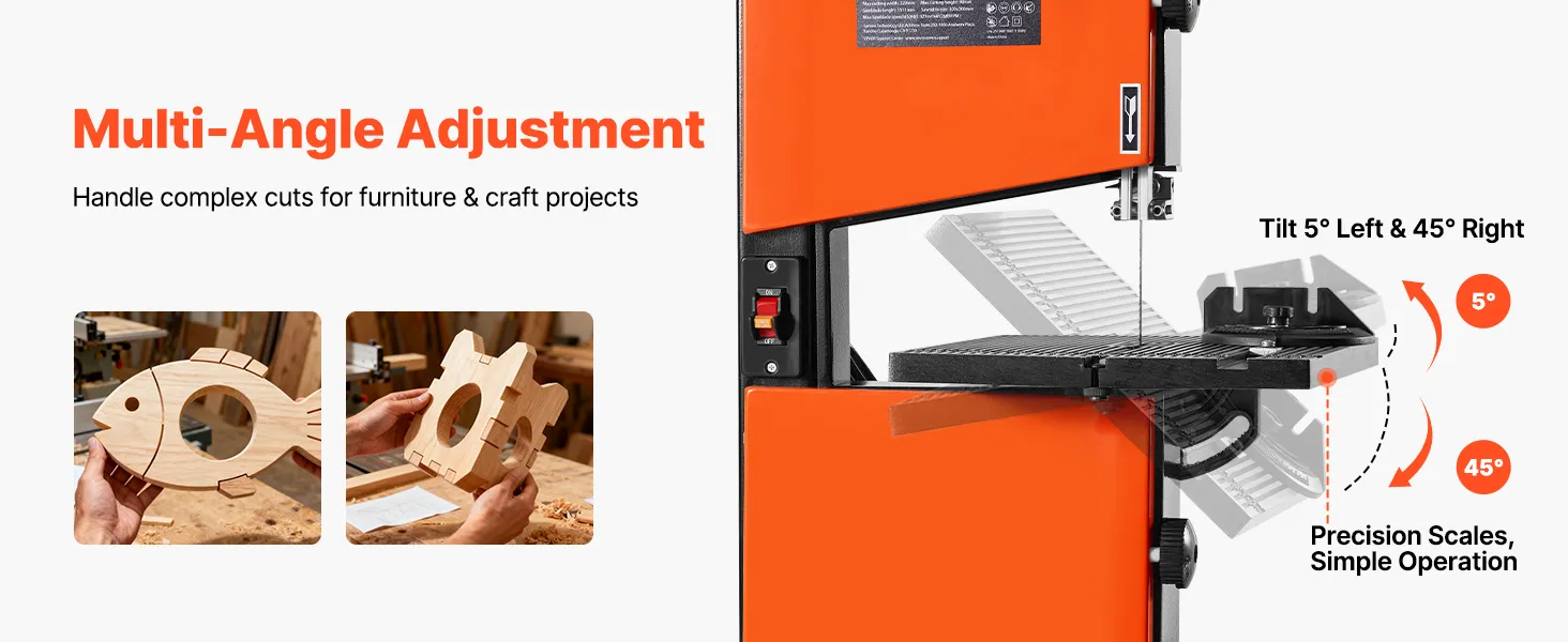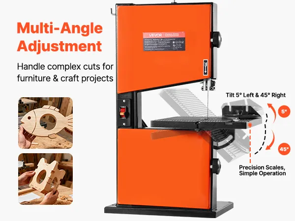 Precision at Every Angle: Tilt the table 5° left and 45° right to handle straight lines, curves, and bevel cuts with ease. This benchtop band saw is designed for accurate results on complex woodworking projects