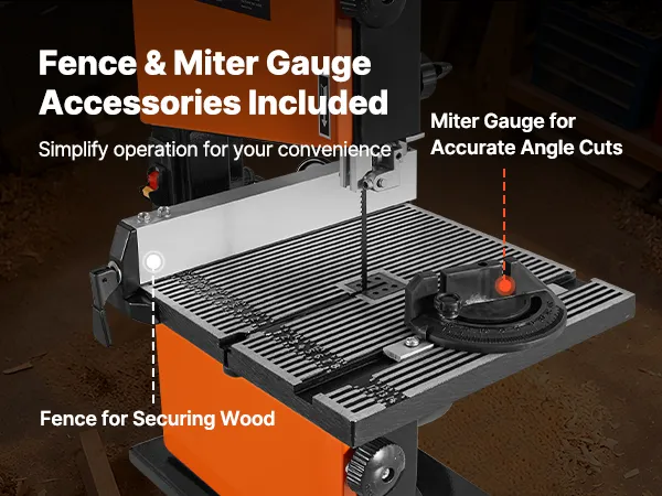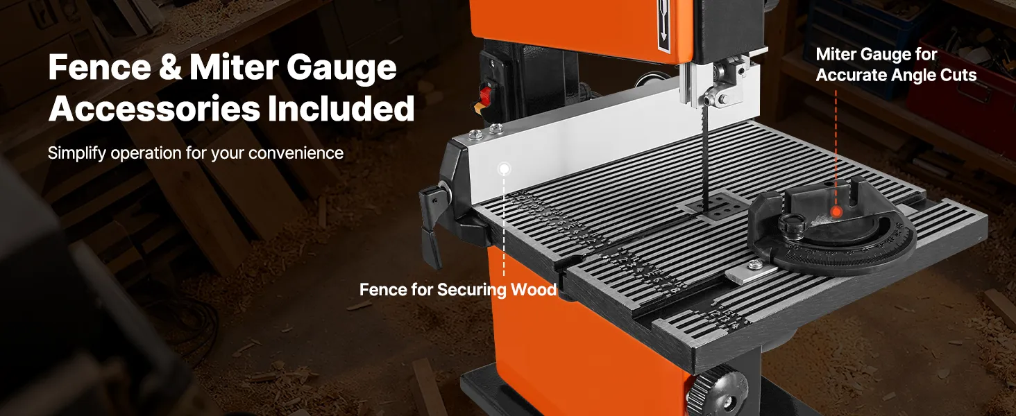 Essential Accessories Included: Comes standard with a fence and miter gauge, this woodworking bandsaw boosts your cutting precision and overall efficiency