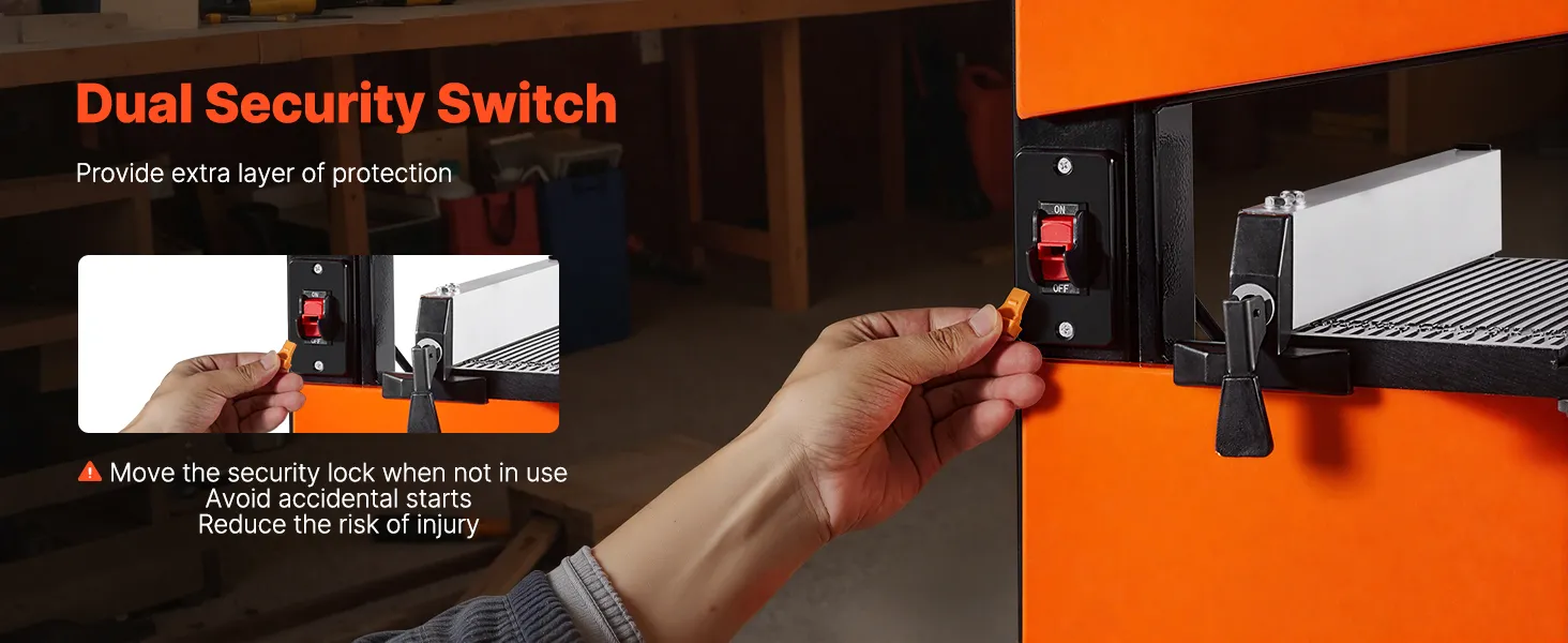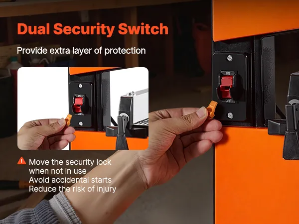 Dual Security Switch Protection: Detach the key when the woodworking tabletop bandsaw is not in use to avoid accidental startups by bumps, power surges, or external interference