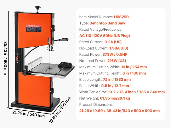 Two-Speed High Efficiency: Equipped with two speeds, a 72-inch blade, a max cutting height of 6 inches, and a max cutting width of 10 inches. This woodworking band saw delivers smooth and precise cuts across a variety of materials