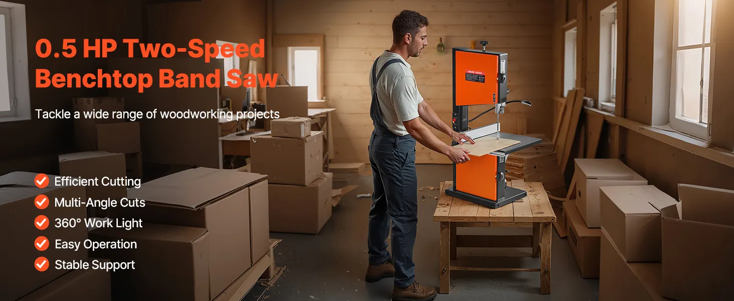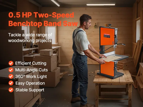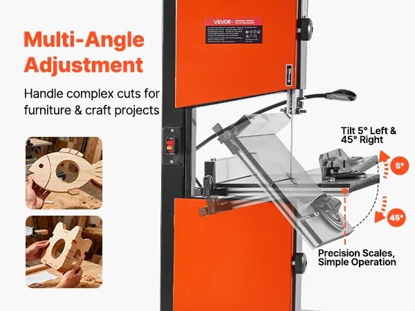 Accurate Multi-Angle Cuts: Tilt the table 5° left and 45° right to handle straight lines, curves, and bevel cuts with ease. This benchtop band saw is designed for accurate results on complex woodworking projects