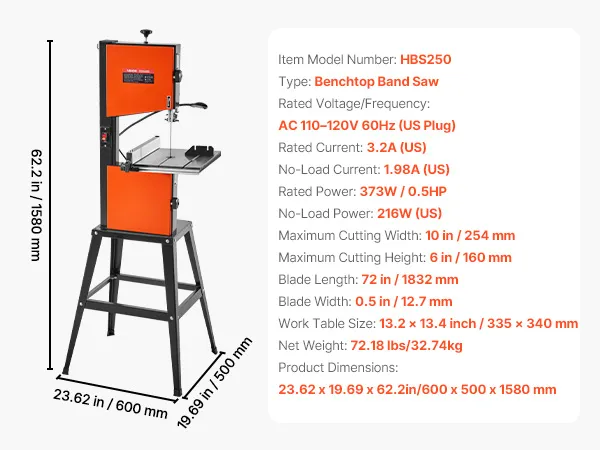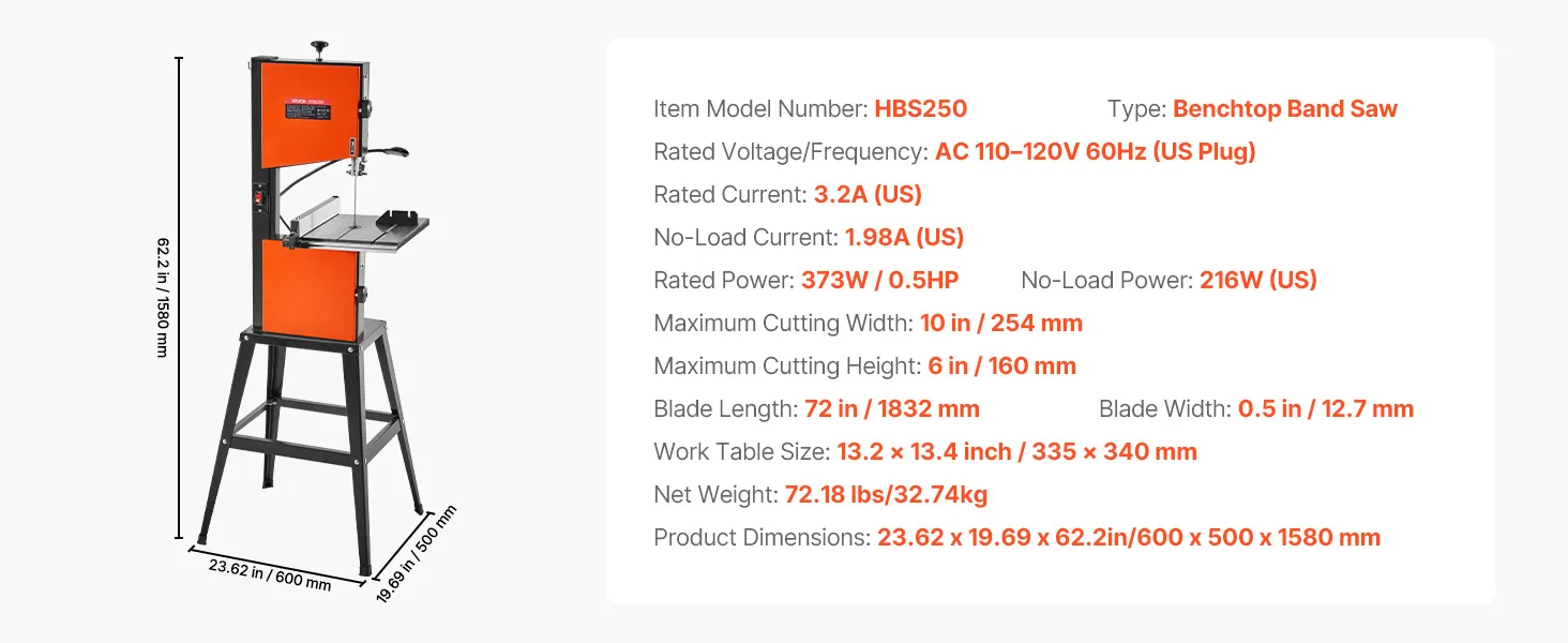 Two-Speed High Efficiency: Equipped with two speeds, a 72-inch blade, a max cutting height of 6 inches, and a max cutting width of 10 inches. This woodworking band saw delivers smooth and precise cuts across a variety of materials