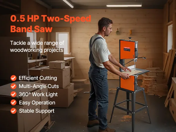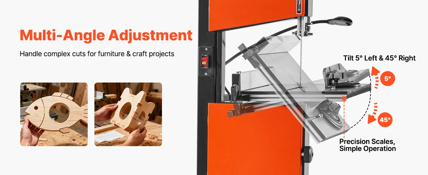 Accurate Multi-Angle Cuts: Tilt the table 5° left and 45° right to handle straight lines, curves, and bevel cuts with ease. This benchtop band saw is designed for accurate results on complex woodworking projects