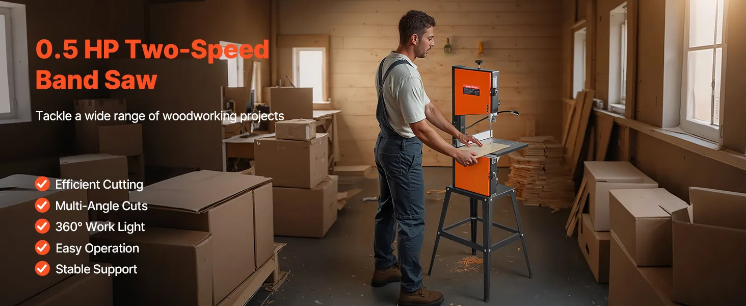 The high-speed precision provides a strong, stable cutting performance. Whether continuously feeding large wood or making deep cuts, this benchtop band saw won’t stall under load, and the saw blade is not easy to shake or jam. Enjoy smooth feeding, clean finishes, and few burrs.