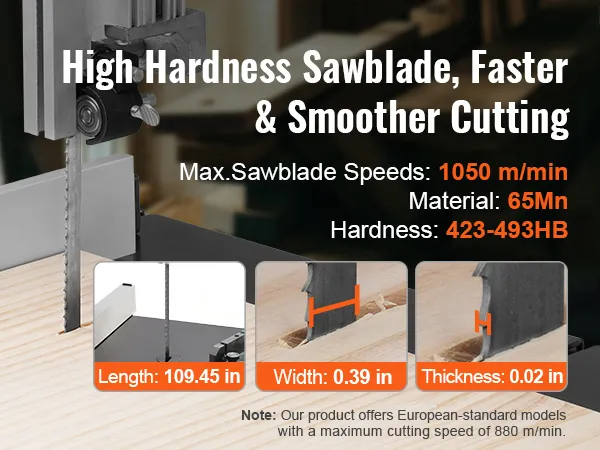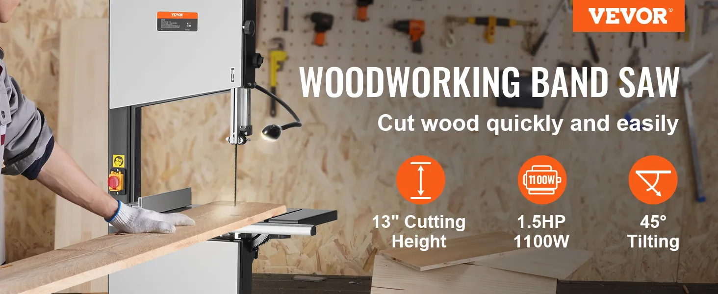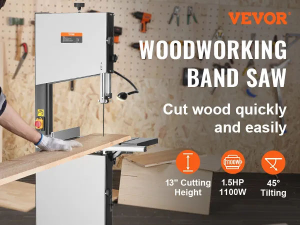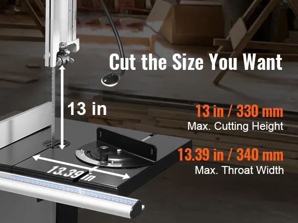 De VEVOR houtbewerkingslintzaag is uitgerust met een zaaghoogte van 330 mm, een zaagbreedte van 340 mm en een 1-1/2 PK 1100W motor. Het heeft ook een traploze snelheidsregeling en een geoptimaliseerd werklicht voor eenvoudige bediening.