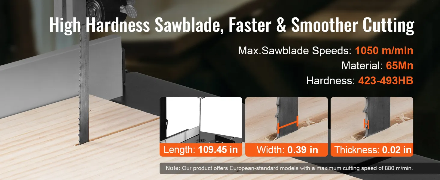 De lengte van het zaagblad is 2780 mm en is gemaakt van 65Mn voor een grotere robuustheid. Max. snelheid: 1050 m/min, dikte: 0,02 inch/0,5 mm, hardheid: 423-493 HB. Opmerking: Ons product biedt Europese standaardmodellen met een maximale snijsnelheid van 880 m/min.
