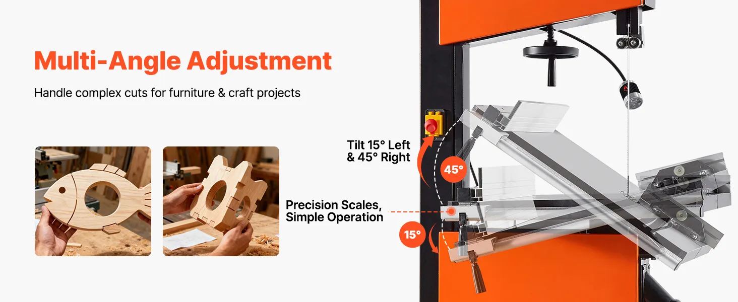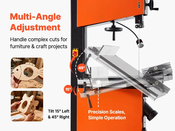 Precision at Every Angle: Tilt the table 15° left and 45° right to handle straight lines, curves, and bevel cuts with ease. This woodworking band saw is designed for accurate results on complex woodworking projects