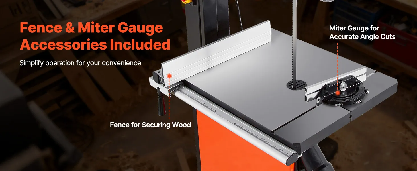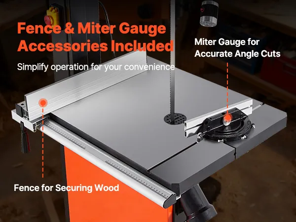 Essential Accessories Included: Comes standard with a fence and miter gauge, this wood working bandsaw boosts your cutting precision and overall efficiency