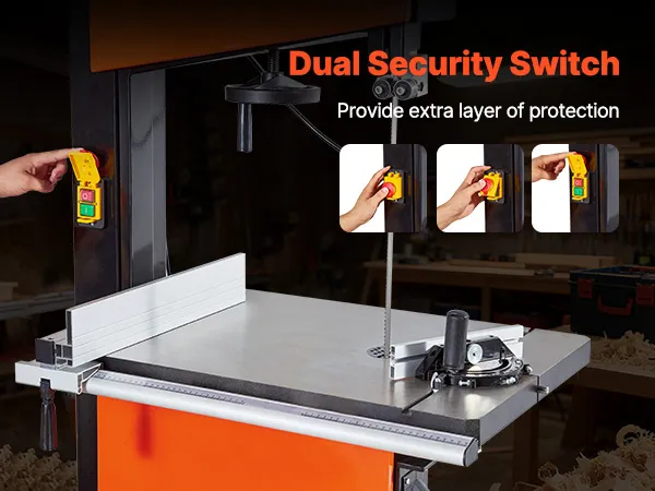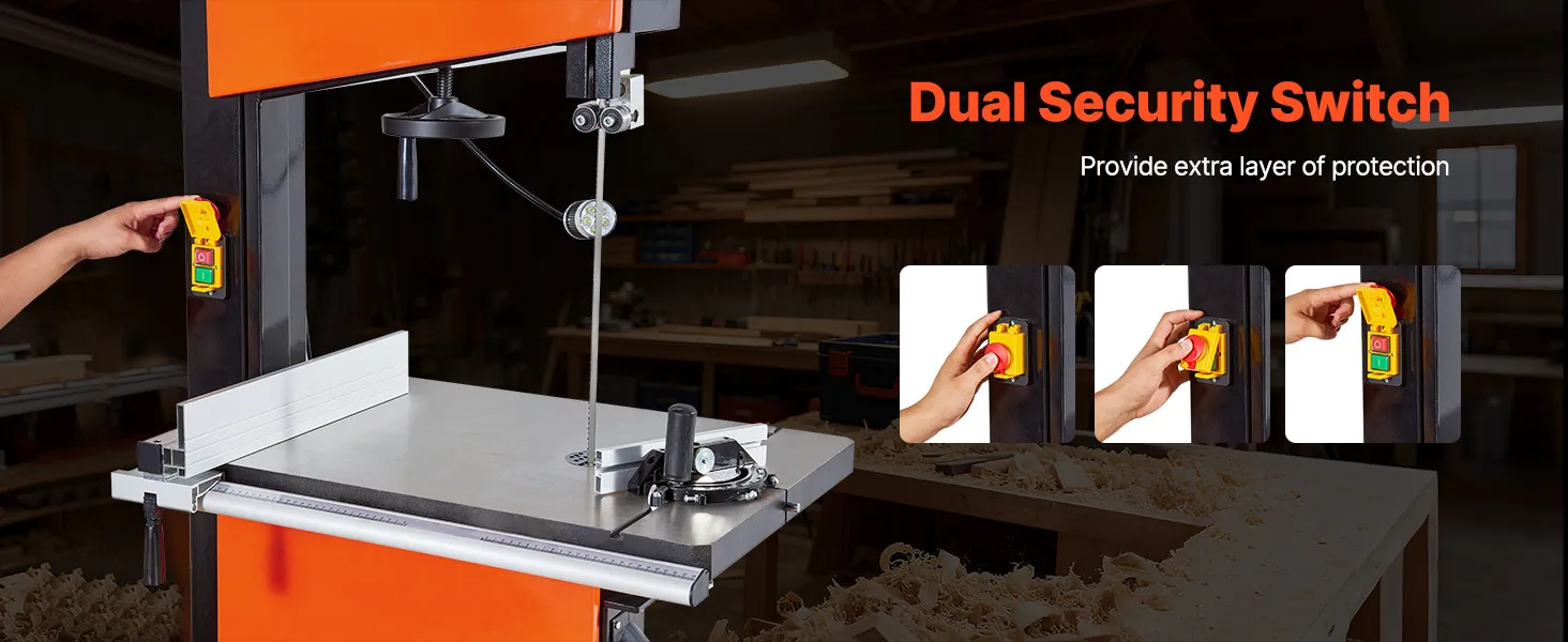 A dual security switch system helps avoid accidental startups caused by bumps, power surges, or external interference. Our band saw for woodworking gives you a peace of mind working environment.