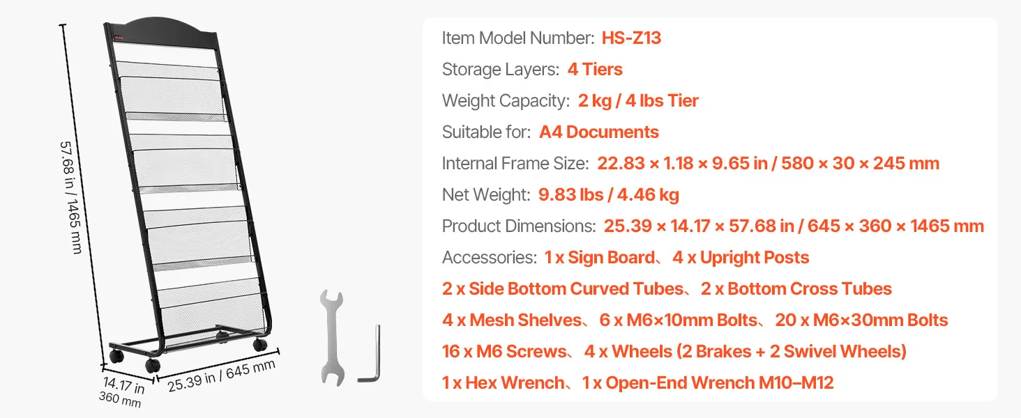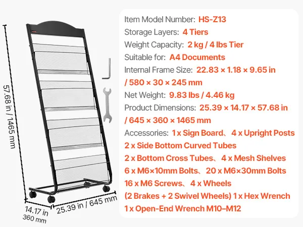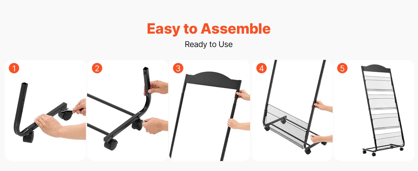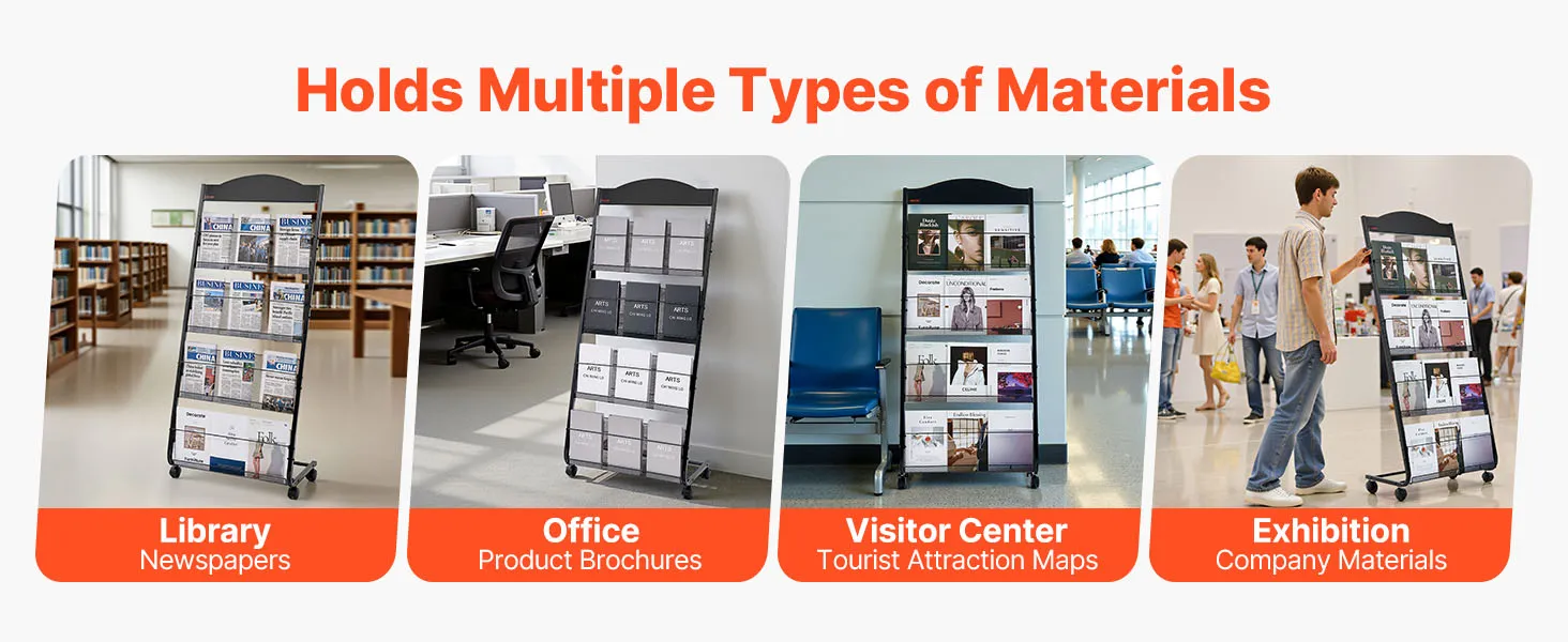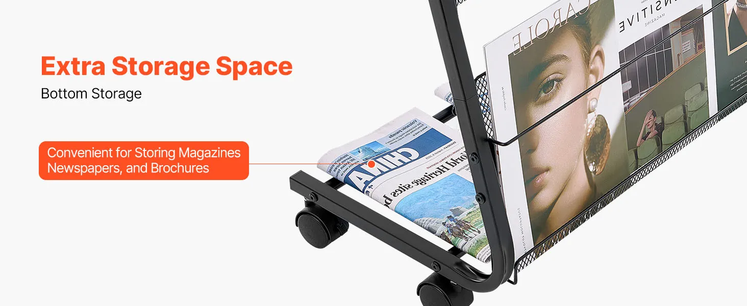 Flexibele beweging en bevestiging: Uitgerust met vier 5 cm wielen (twee met rem) voor eenvoudige verplaatsing en stabiele bevestiging. Of u de positie nu dagelijks aanpast of regelmatig verplaatst, dit staande tijdschriftenrek biedt een soepele gebruikservaring.