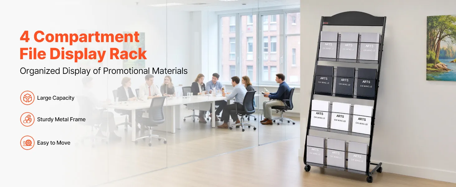 Met deze brochurehouder met 4 compartimenten kunt u op eenvoudige wijze diverse promotiematerialen, documenten, tijdschriften, enz. ordenen en tentoonstellen. Of het nu op kantoor, in vergaderruimtes of in bibliotheken is, met deze houder zijn de materialen duidelijk zichtbaar, wat de werkefficiëntie en de effectiviteit van presentaties verbetert.
