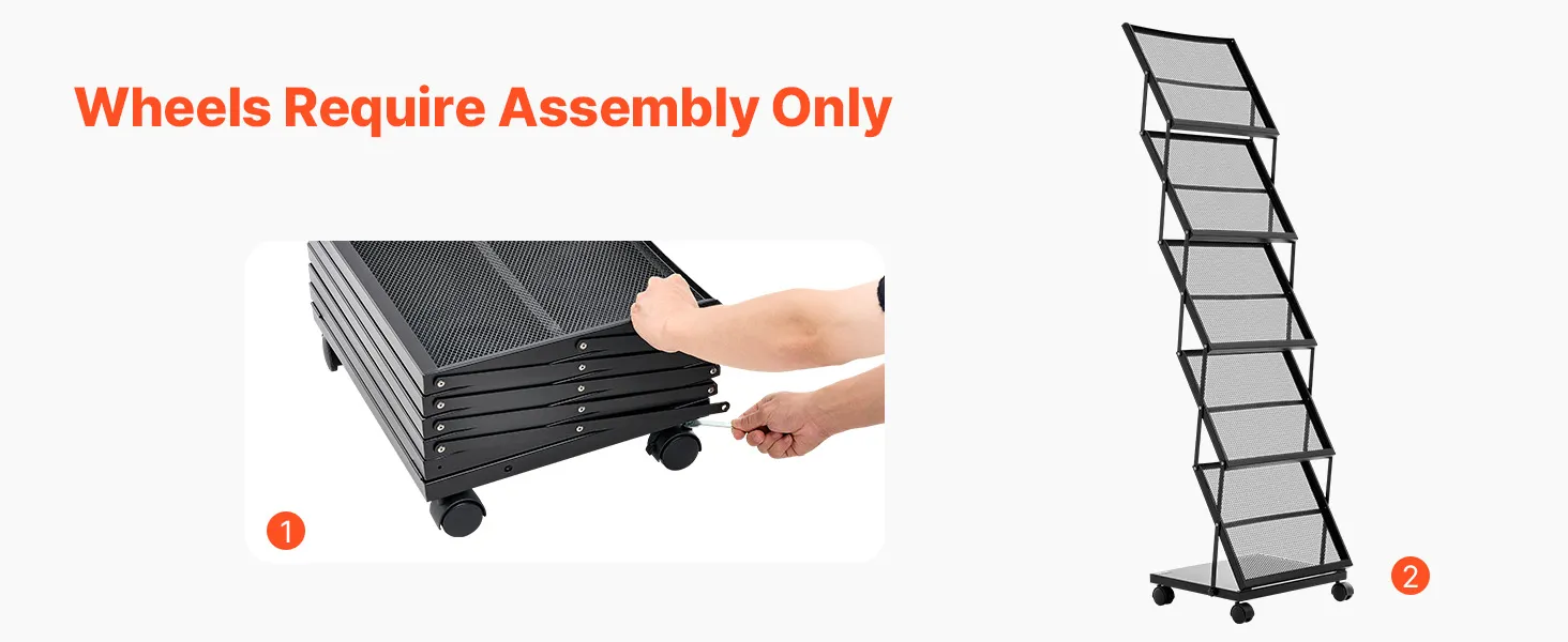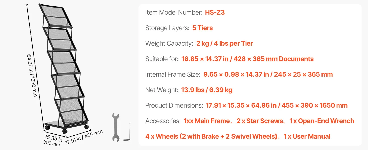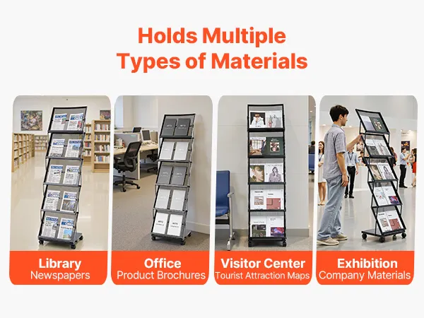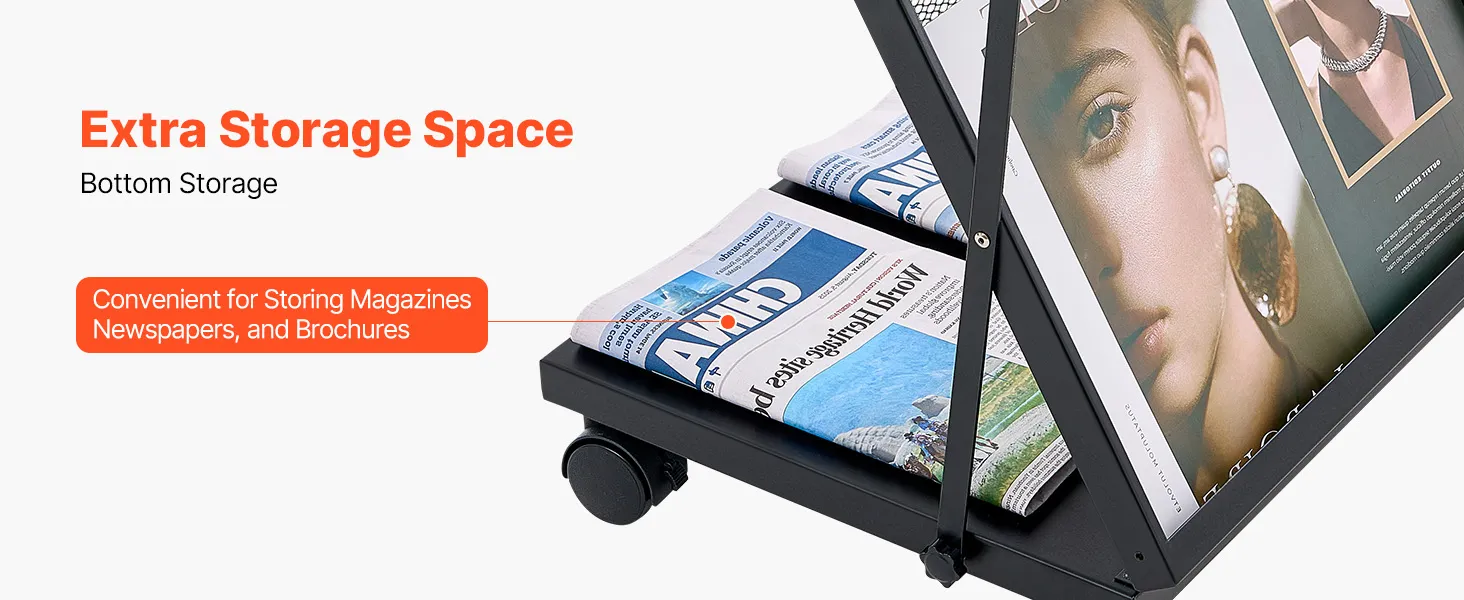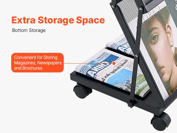 Flexibele beweging en bevestiging: Uitgerust met vier 5 cm wielen (twee met rem) voor eenvoudige verplaatsing en stabiele bevestiging. Of u de positie nu dagelijks aanpast of regelmatig verplaatst, dit staande tijdschriftenrek biedt een soepele gebruikservaring.