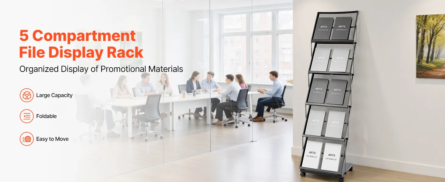 Met deze brochurehouder met 5 compartimenten kunt u op eenvoudige wijze diverse promotiematerialen, documenten, tijdschriften, enz. ordenen en tentoonstellen. Of het nu op kantoor, in vergaderruimtes of in bibliotheken is, met deze houder zijn de materialen duidelijk zichtbaar, wat de werkefficiëntie en de effectiviteit van presentaties verbetert.