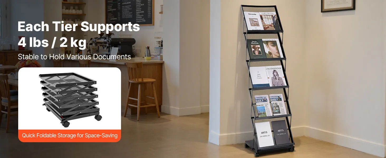 Robuuste en duurzame constructie: deze brochurestandaard is gemaakt van dik metaal, heeft een glad en elegant oppervlak en is roest- en corrosiebestendig. Elke plank kan 2 kg dragen en het opvouwbare ontwerp maakt flexibele aanpassing mogelijk.