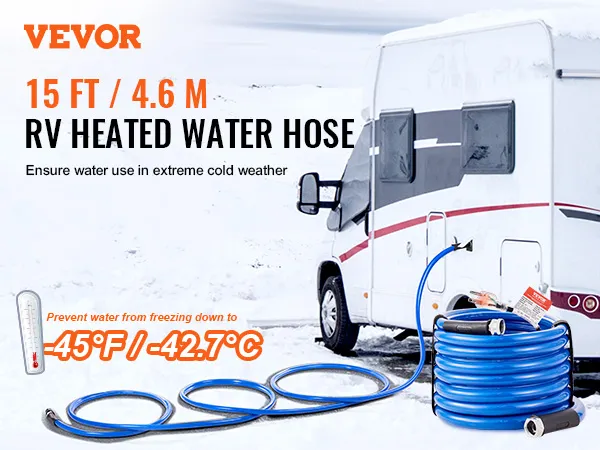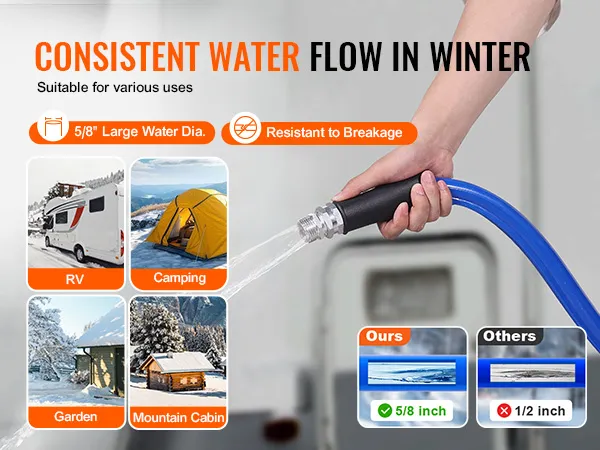 Stay Flowing in Low Temps: Even when winter nights drop to -45°F/-42.7℃, our heated RV water hose ensures steady water flow, preventing freezing and providing reliable water access. Available in 15, 25, 30, 50, 75 and 100 ft lengths, it's perfect for RVs, trailers, boats, garden hoses, plant watering, and car washing in winter.