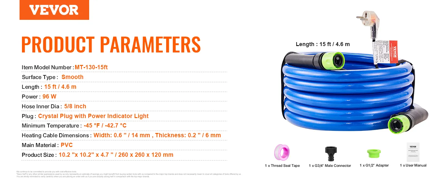 VEVOR 15ft Heated Water Hose for RV, Heated Drinking Water Hose Antifreeze to -45°F, Automatic Self-regulating, 5/8" I.D. with Quick-connect Fitting Set, Lead and BPA Free