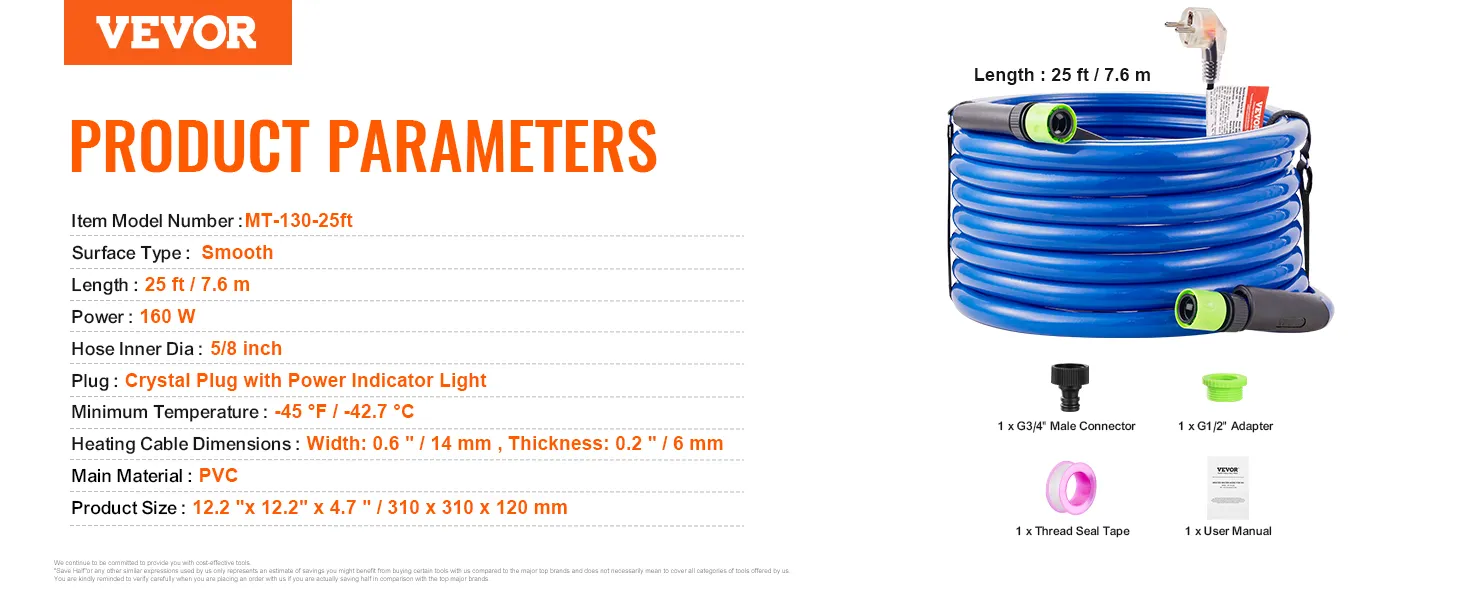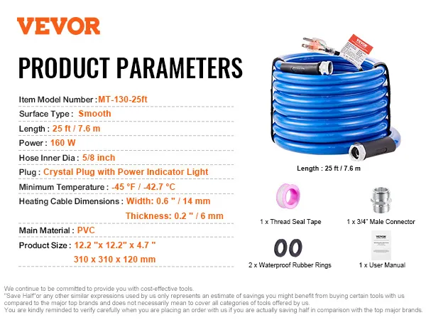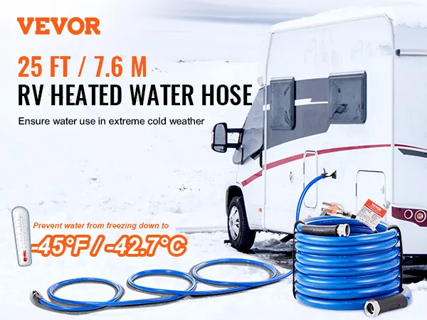 In de meeste regio's bevriezen gewone waterslangen tijdens winternachten als gevolg van lage temperaturen. Met een VEVOR verwarmde waterslang voor campers kunt u zelfs bij -42,7℃ genieten van een normaal waterverbruik op de camping.