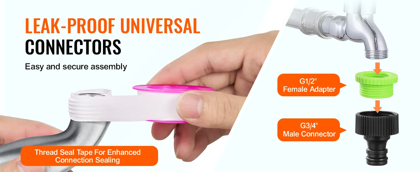 Lekvrije slangaansluiting: de snelkoppeling met binnendraad is compatibel met de meeste waterbronnen. Dit veelzijdige accessoire is bestand tegen een waterdruk van 0,6 MPa (80 PSI). Inclusief een G3/4" mannelijke connector en vrouwelijke adapter, evenals schroefdraadafdichtingstape voor een betere afdichting.