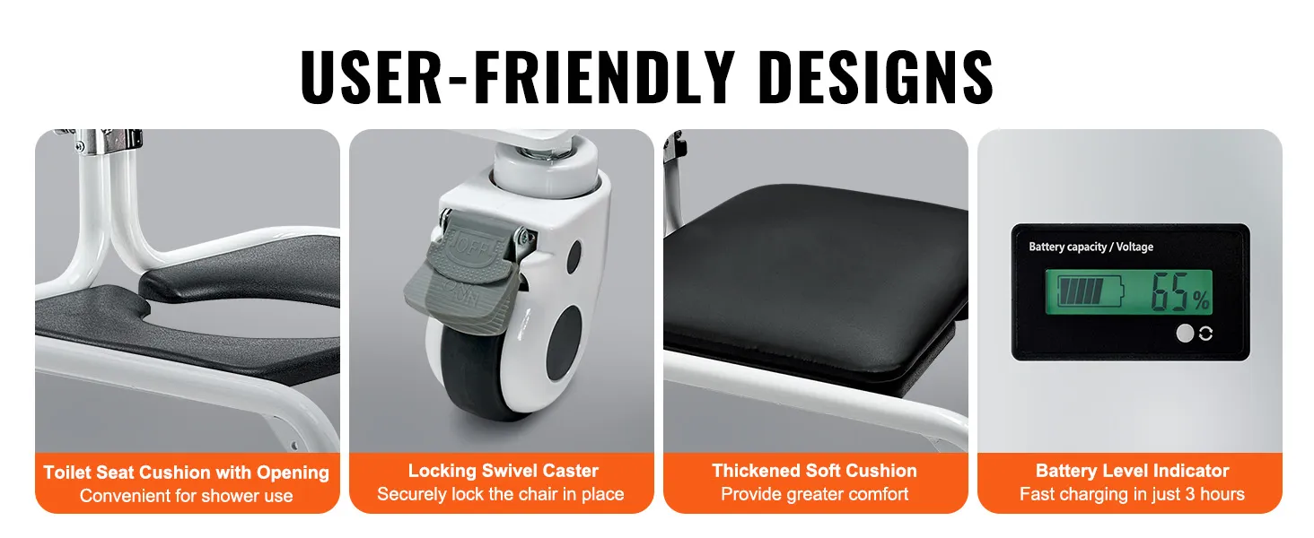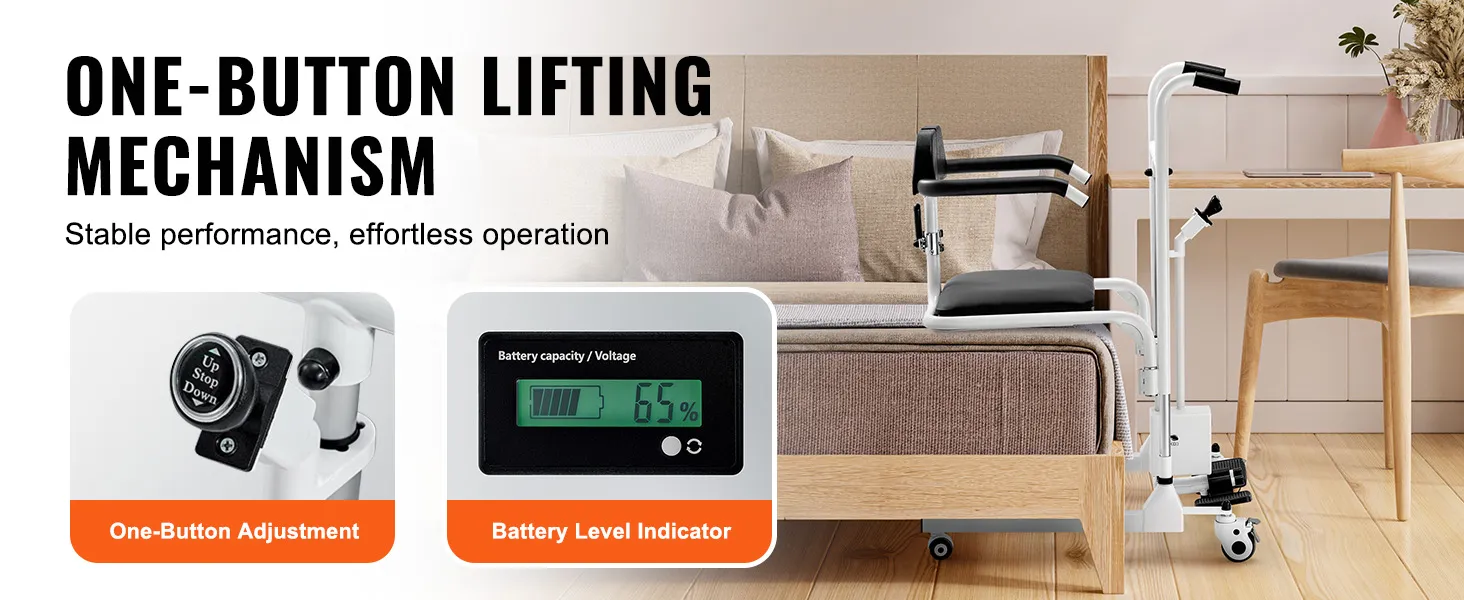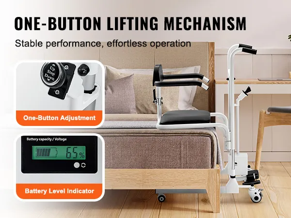 VEVOR electric patient lift transfer chair is the perfect solution for elderly and disabled individuals. It features one-button electric lifting, locking swivel casters, IP44 waterproof rating, and a battery level indicator, ensuring safe and stable transfer whether used indoors or outdoors.