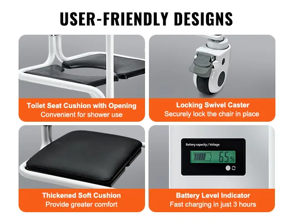 Designed with a 180° split seat and bedpan, locking swivel casters for stable mobility, thick soft cushion for added comfort, and 4 hours fast-charging battery, every aspect of this transfer wheelchair is crafted to maximize comfort and convenience.