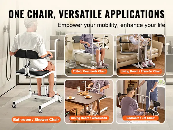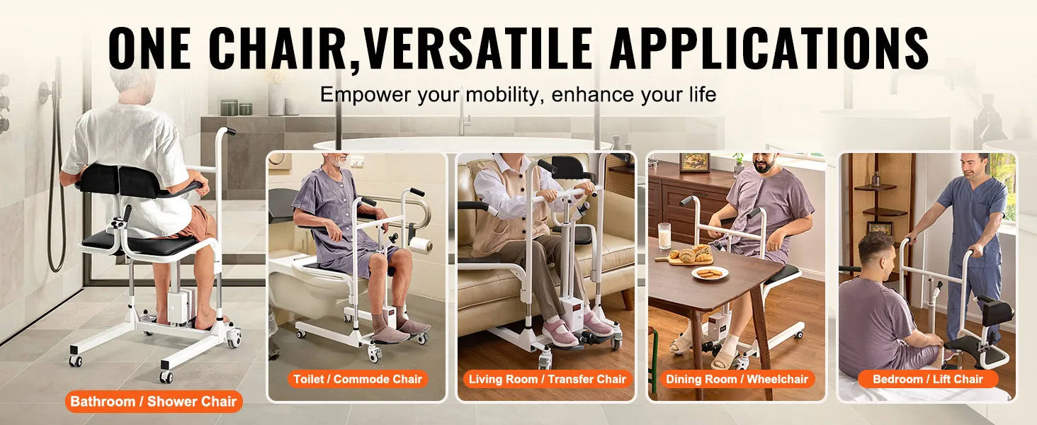 Effortless and Safe Transfer: VEVOR electric patient lift transfer chair features 13.0" height adjustment range, allowing easy transfers for immobile patients from bed to wheelchair, seat, or car. It also assists with showering, toileting, and outdoor mobility, simplifying daily patient care and offering great convenience for caregivers.