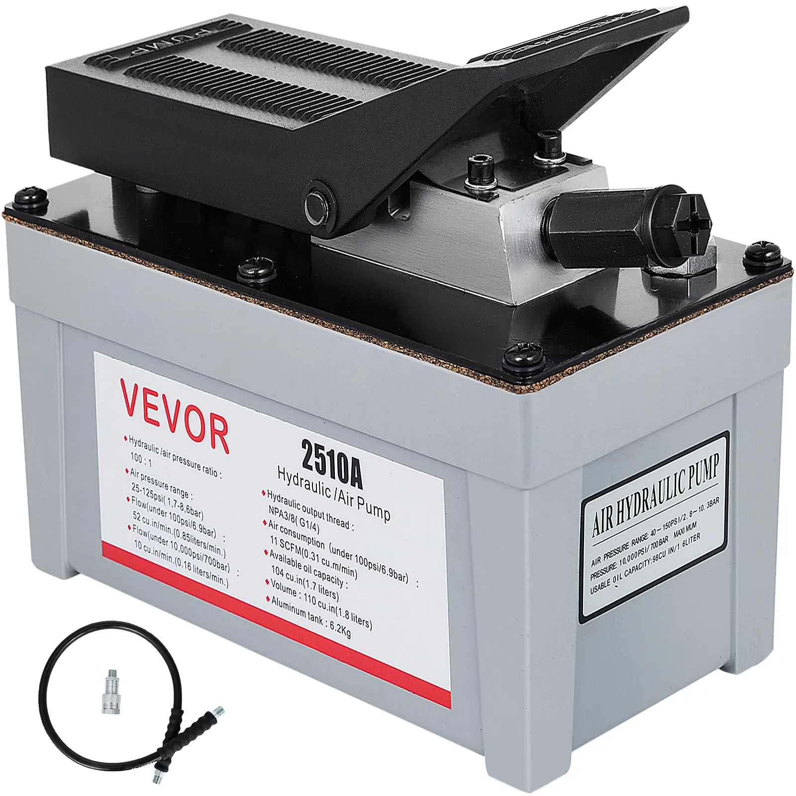 1.6L ± 0.1L brandstoftank van aluminiumlegering, slijtvast. Stroomsnelheid: 52 kubieke inch per minuut. De hydraulische oliepomp is uitgerust met hogedrukslangen, die duurzaam en slijtvast zijn, zodat u zich geen zorgen hoeft te maken over olielekkage.