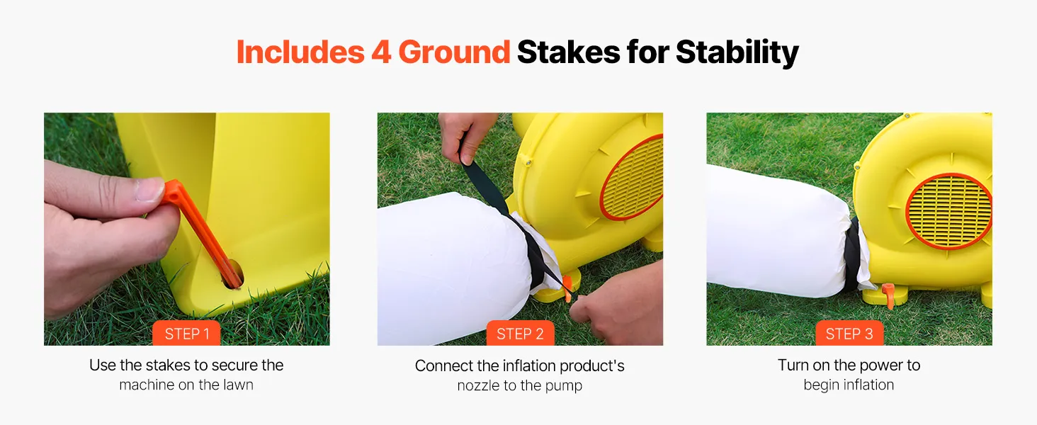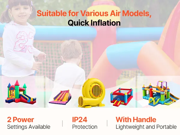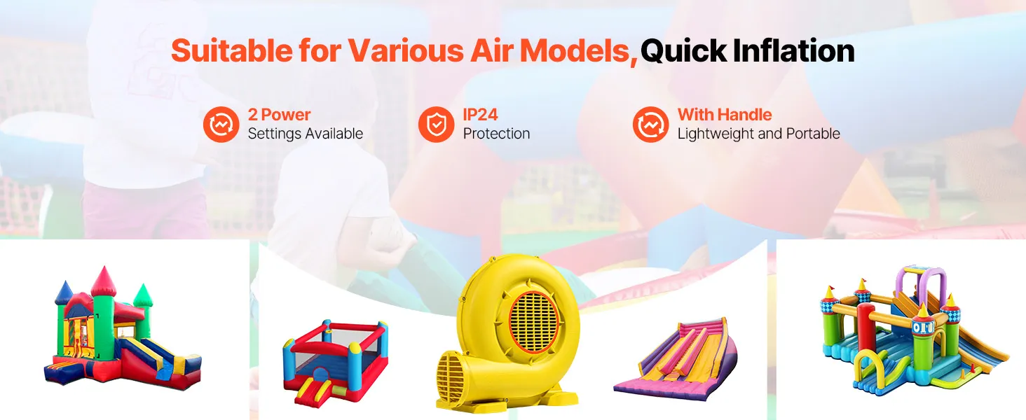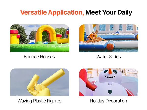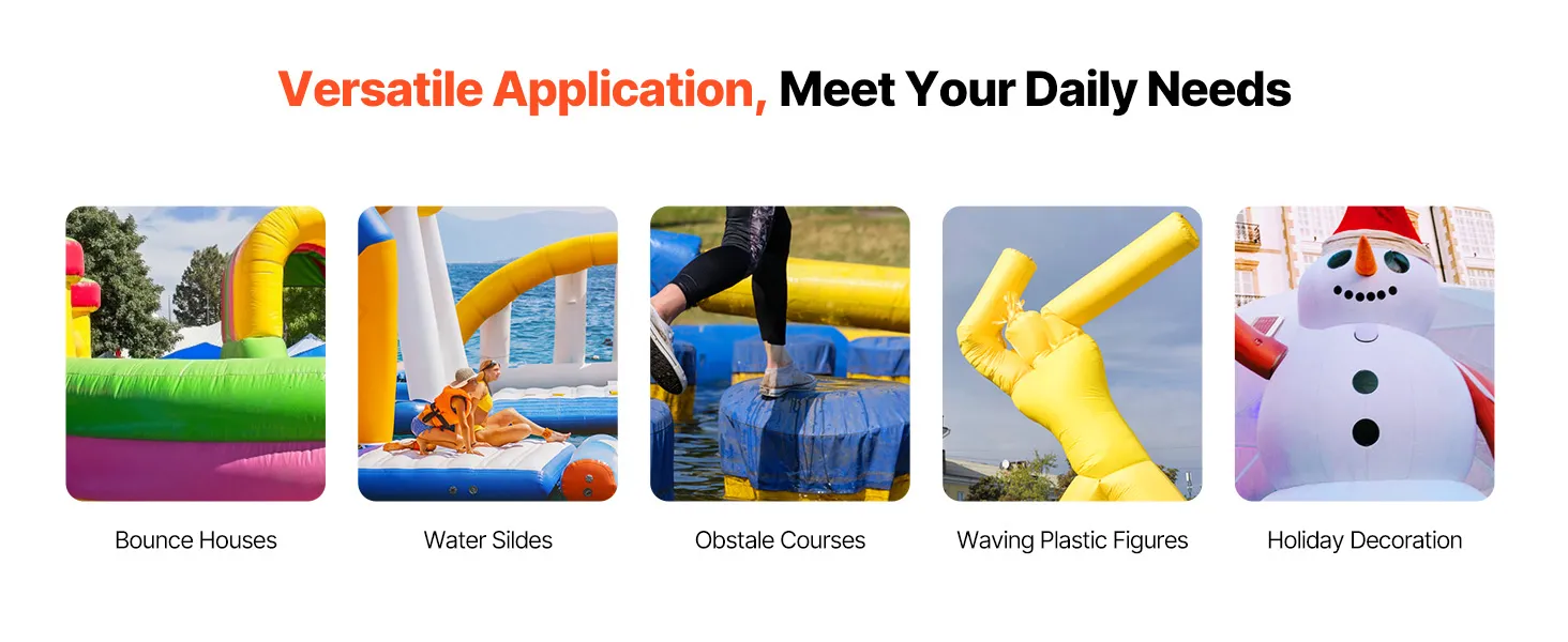 Geschikt voor verschillende opblaasbare modellen: of het nu een opblaasbare glijbaan, kerstspringkasteel, springkasteel, opblaasbare tent of opblaasbaar zwembad is, onze luchtblazers kunnen aan uw opblaasbehoeften voldoen.