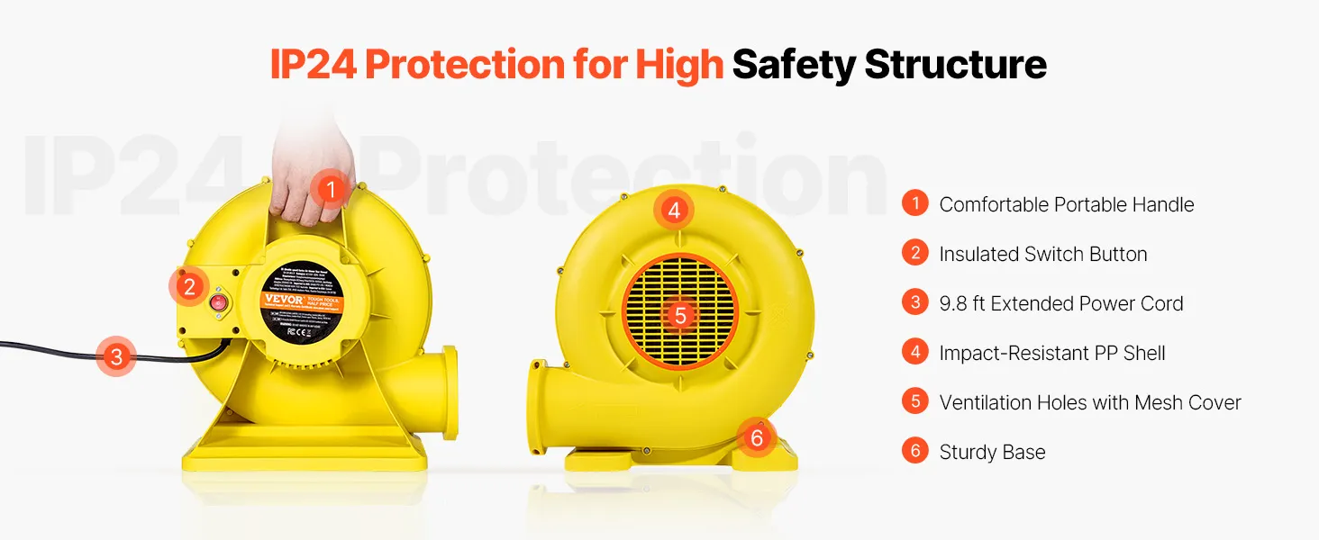 Krachtige motor: onze ventilatoren bieden twee snelheidsinstellingen (0,8 en 0,9 pk instelbaar) met een maximale snelheid van 2750 tpm. Met een vermogen van 690 W produceren ze een sterke luchtstroom voor snel opblazen, waardoor de algehele werkefficiëntie wordt verbeterd.
