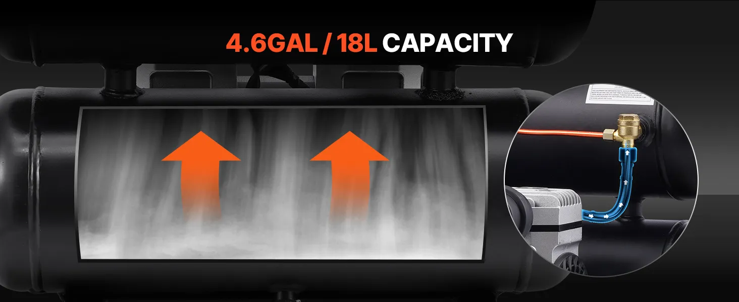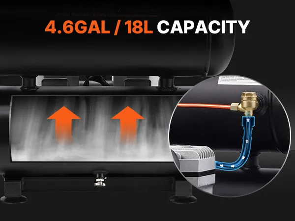 Equipped with a 4.6-gallon air tank, this air compressor is compactly designed for easy mobility and use in various work environments. The small-capacity air tank reduces weight and size, making it easy to store and carry.