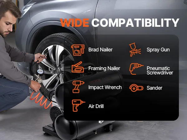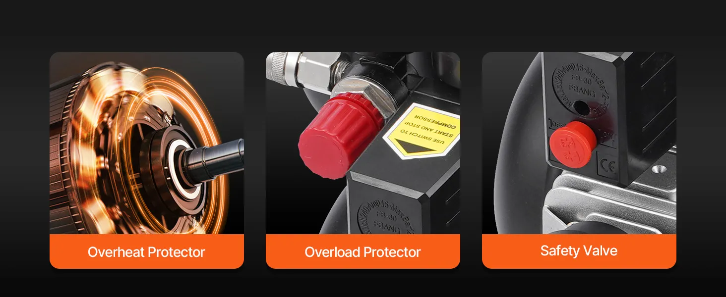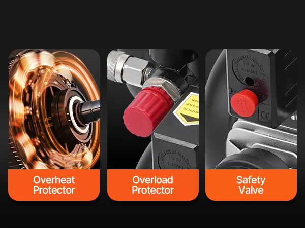 Security Comes First: The air compressor tank is equipped with large cooling fan and automatic overheating protection to prevent damage. In addition, when the current or storage pressure is too high, the compressor will automatically shut off or provide pressure relief protection.