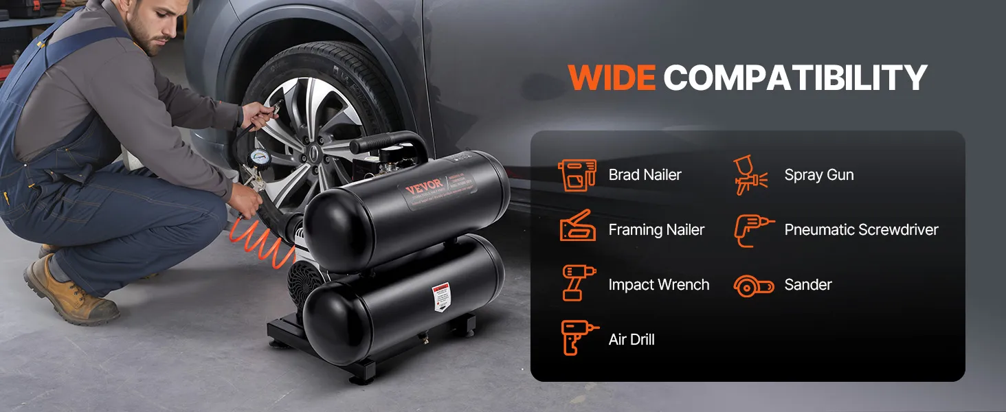 4.6 Gallon Air Compressor: Our 650W oil-free motor drives the compressor up to a speed of 2800 r/min and 2.0 CFM@ 90 PSI air delivery. It is ideal for supporting a variety of pneumatic and air tools, such as nail gun, impact wrench, spray gun, pneumatic screwdriver, best for tire inflation, auto repair, spray painting, woodwork nailing, etc.
