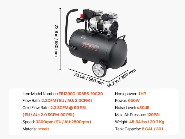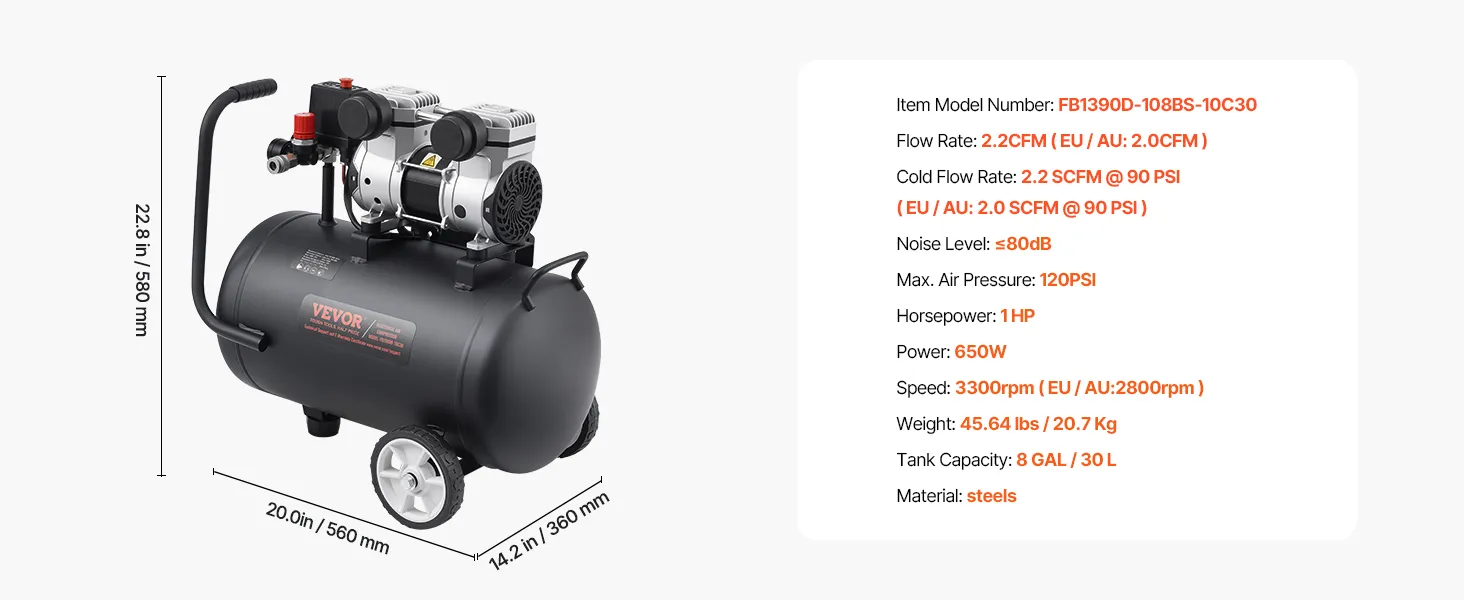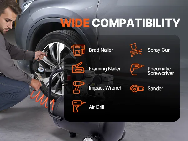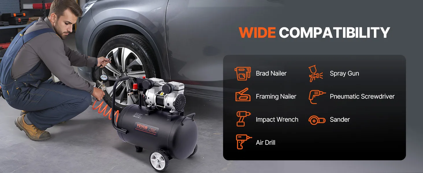 8 Gallon Air Compressor: Our 650W oil-free motor drives the compressor up to a speed of 2800 r/min and 2.0 CFM@ 90 PSI air delivery. It is ideal for supporting a variety of pneumatic and air tools, such as nail gun, impact wrench, spray gun, pneumatic screwdriver, best for tire inflation, auto repair, spray painting, woodwork nailing, etc.