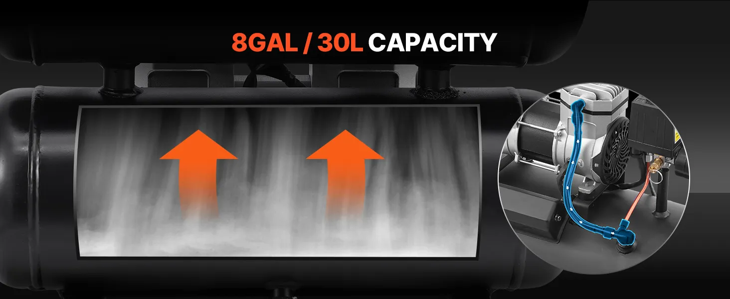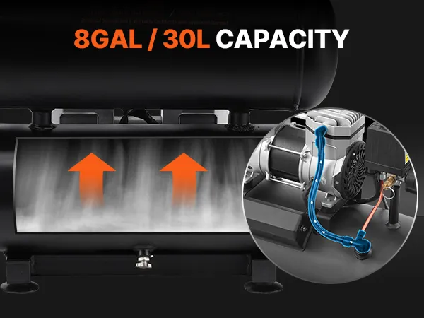 This horizontal air compressor comes with an 8-gallon large capacity air tank, providing ample air reserve. It ensures continuous and stable air supply during long and intense work sessions.