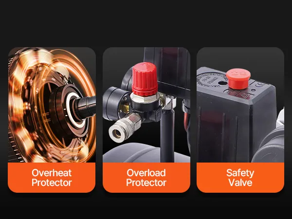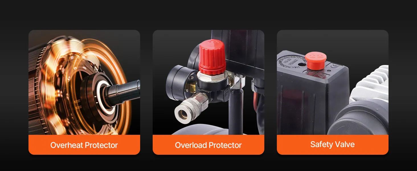 Security Comes First: The air compressor tank is equipped with large cooling fan and automatic overheating protection to prevent damage. In addition, when the current or storage pressure is too high, the compressor will automatically shut off or provide pressure relief protection.