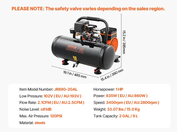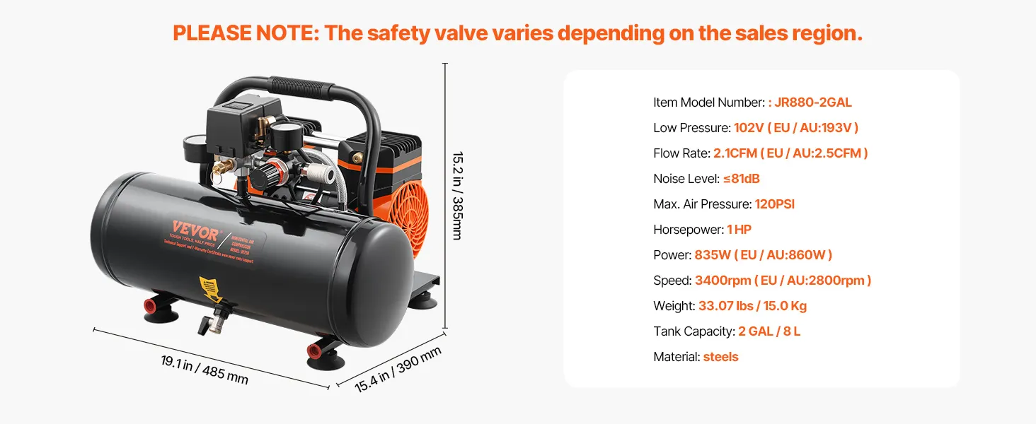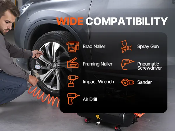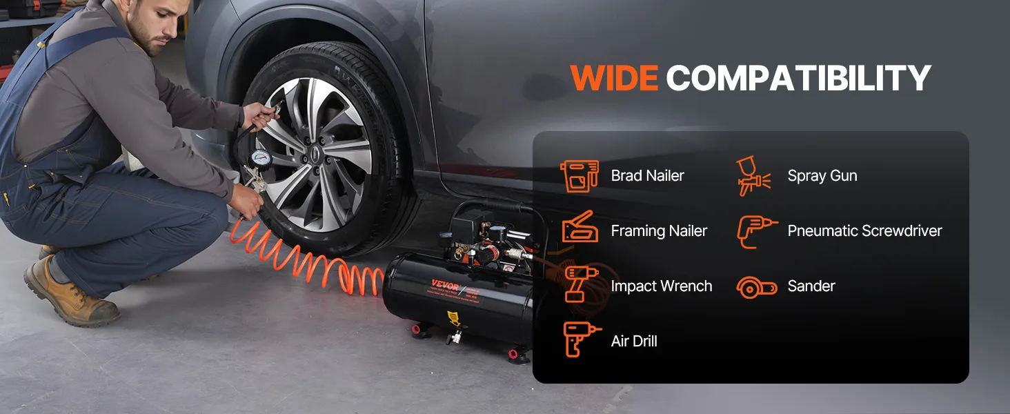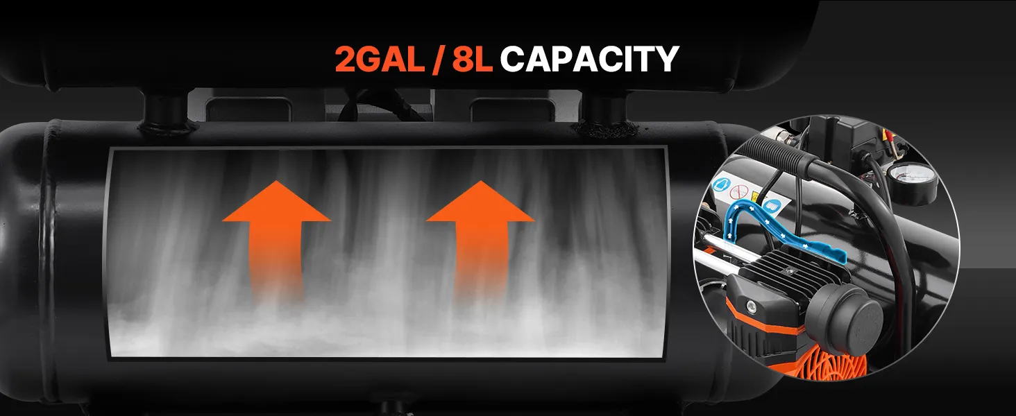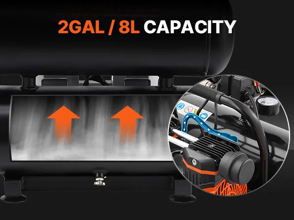 Luchtcompressor van 2 gallon / 8 liter: onze olievrije motor van 860 W drijft de compressor aan met een snelheid van 2800 tpm en een luchtopbrengst van 2,5 CFM bij 8 bar. Het is ideaal voor het ondersteunen van een groot aantal pneumatische en luchtgereedschappen, zoals schiethamers, slagmoersleutels, spuitpistolen, luchtsleutels, het beste voor het oppompen van banden, autoreparaties, spuitlakken, spijkeren in houtwerk, enz.