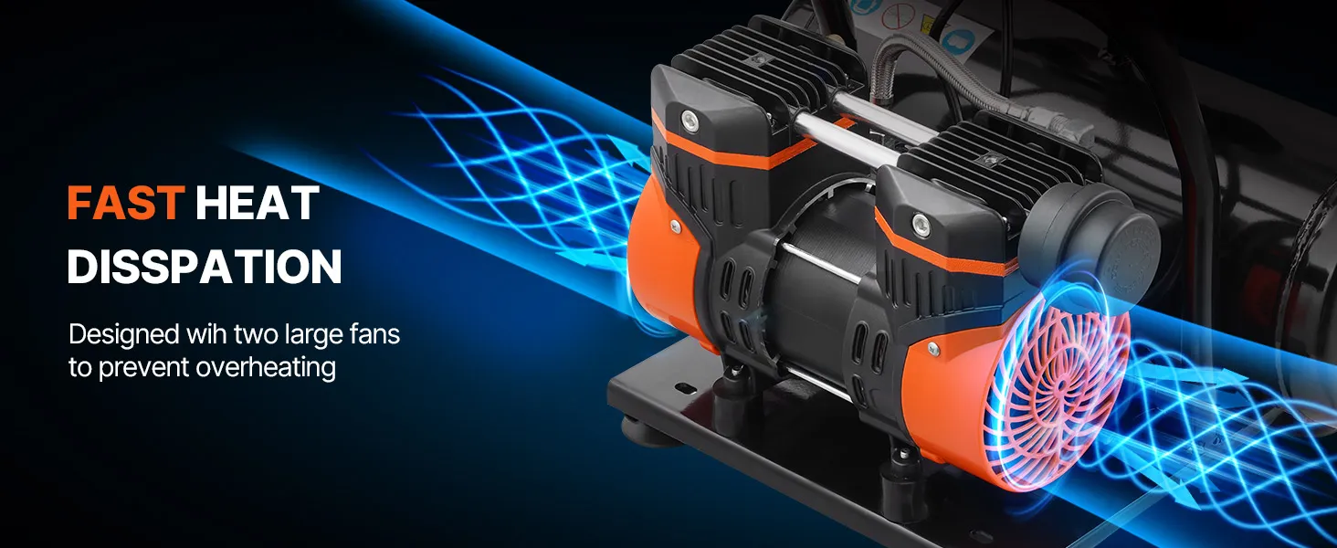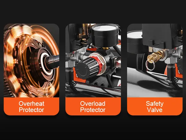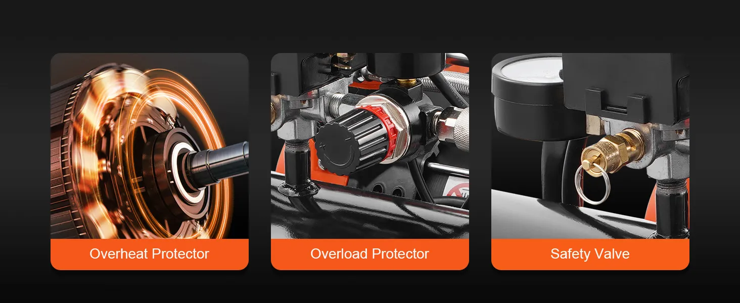 Veiligheid staat voorop: de luchtcompressortank is uitgerust met een grote koelventilator en automatische oververhittingsbeveiliging om schade te voorkomen. Bovendien schakelt de compressor automatisch uit of zorgt voor drukontlastingsbescherming wanneer de stroom- of opslagdruk te hoog is.