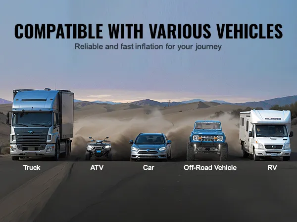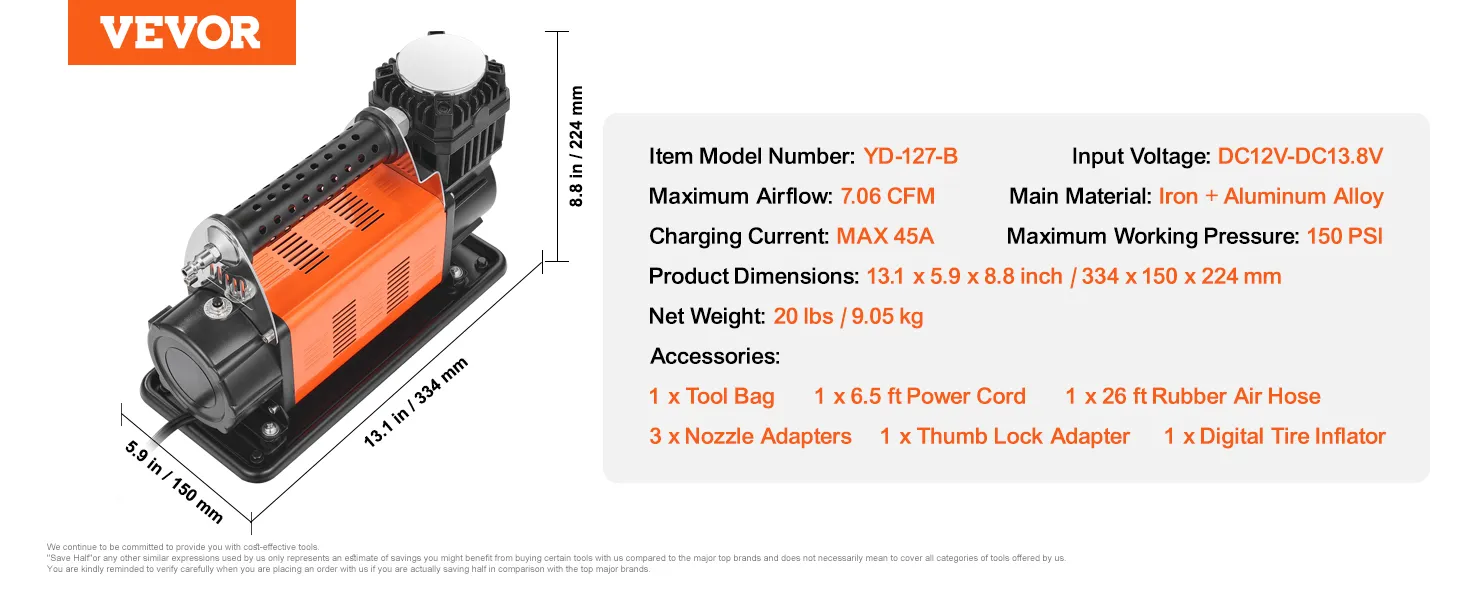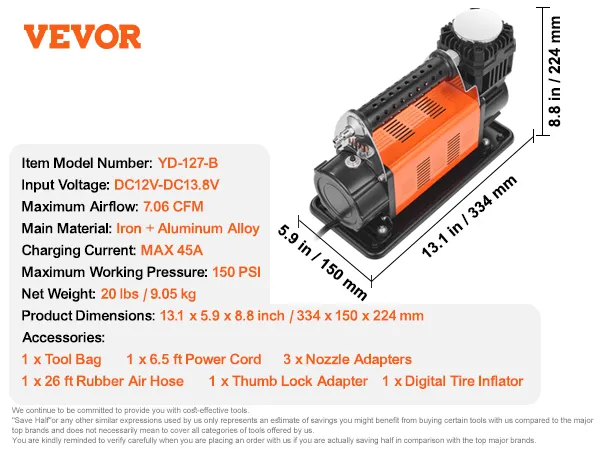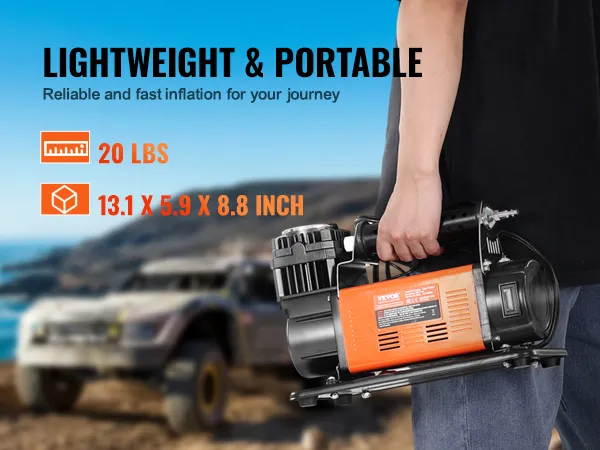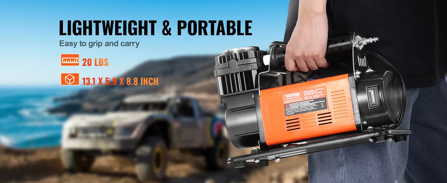 Snel oppompen: de VEVOR 12V-luchtcompressor voor zwaar gebruik levert een maximale druk van 150 PSI en een efficiënte luchtstroom van 7,06 CFM, waardoor een snelle bandenspanning binnen enkele minuten wordt gegarandeerd. Ga snel weer de weg op en bespaar kostbare tijd.