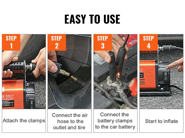 Met een eenvoudig proces van 4 stappen: bevestig de klemmen, sluit de luchtslang aan op de luchtuitlaat en de band, bevestig de accuklem aan de accu van uw voertuig en begin met het oppompen. Voltooi uw opblaastaken met gemak en moeite.