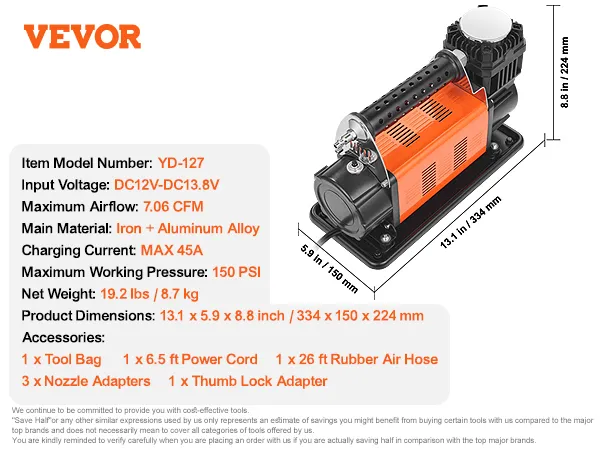 Snel oppompen: de VEVOR 12V-luchtcompressor voor zwaar gebruik levert een maximale druk van 150 PSI en een efficiënte luchtstroom van 7,06 CFM, waardoor een snelle bandenspanning binnen enkele minuten wordt gegarandeerd. Ga snel weer de weg op en bespaar kostbare tijd.