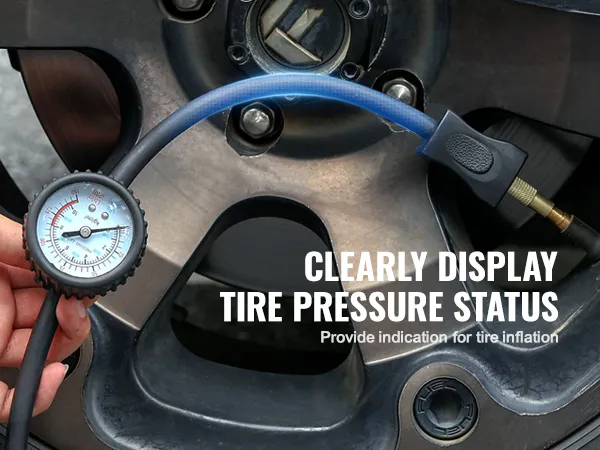 Wij leveren u een 2 meter lange stroomkabel en een 8 meter lange rubberen luchtslang. De luchtslang is ook voorzien van een mechanische manometer die zorgt voor realtime drukmonitoring, zodat u de luchtdruk te allen tijde kunt controleren.