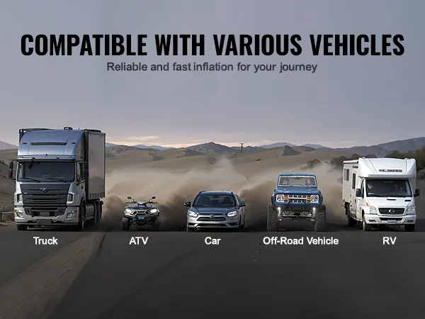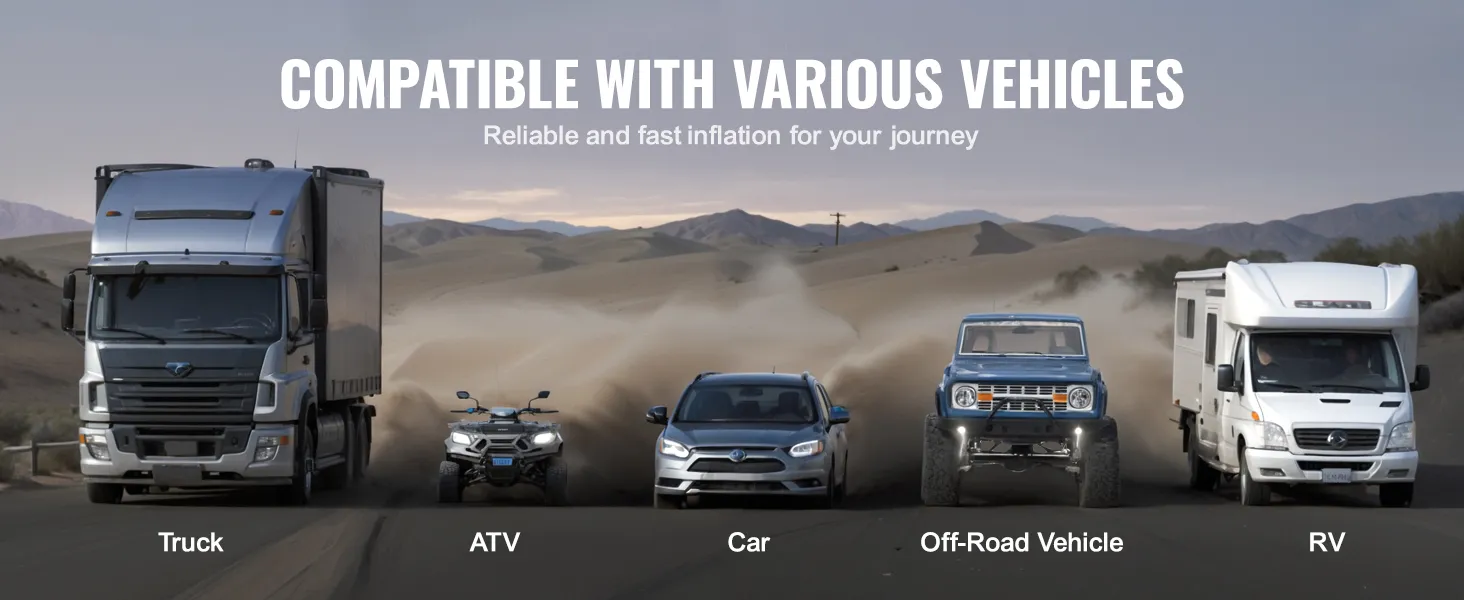 Met 3 mondstukadapters is deze 12V draagbare bandenpomp veelzijdig inzetbaar voor diverse voertuigen, waaronder auto's, SUV's, vrachtwagens, bestelwagens en campers. Het is ook geschikt voor motorfietsen, fietsen, ballen en andere vrijetijdsartikelen zoals opblaasbaar speelgoed en boten.
