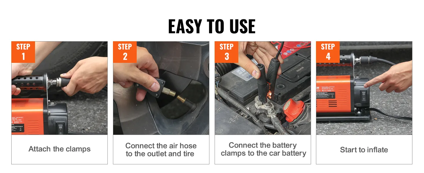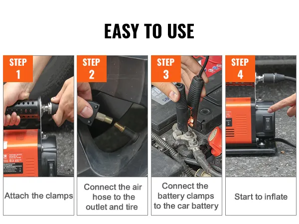 Met een eenvoudig proces van 4 stappen: bevestig de klemmen, sluit de luchtslang aan op de luchtuitlaat en de band, bevestig de accuklem aan de accu van uw voertuig en begin met het oppompen. Voltooi uw opblaastaken met gemak en moeite.