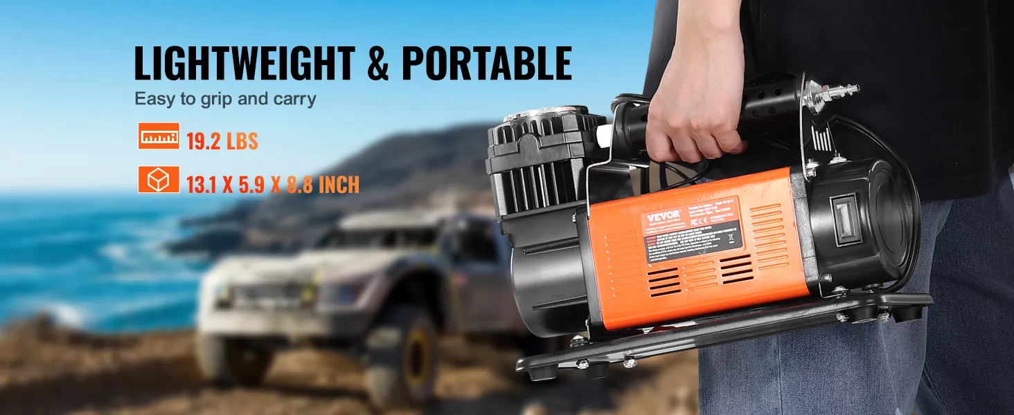 Blijf voorbereid met de VEVOR 12V Heavy Duty draagbare luchtcompressor. Met een maximale druk van 150 PSI en een snelle luchtstroom van 7,06 CFM zorgt deze draagbare bandenpomp ervoor dat u snel weer de weg op kunt en kostbare tijd bespaart.