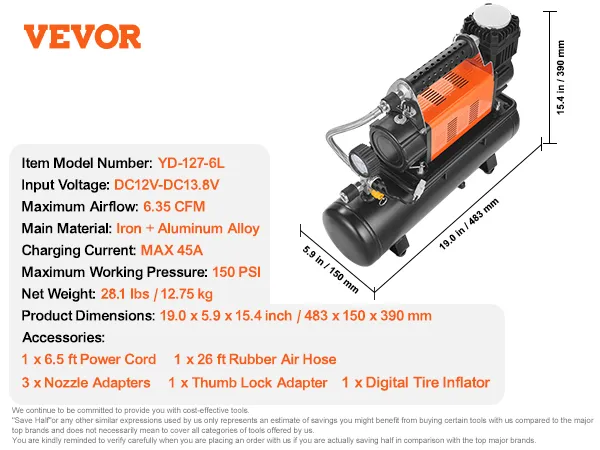 Stay prepared with VEVOR portable 12V heavy duty air compressor with 6L tank and digital inflator — your reliable companion for hassle-free inflation anytime, anywhere. With 150 PSI maximum pressure and 6.35 CFM high airflow, this tire inflator gets you back on the road in no time.