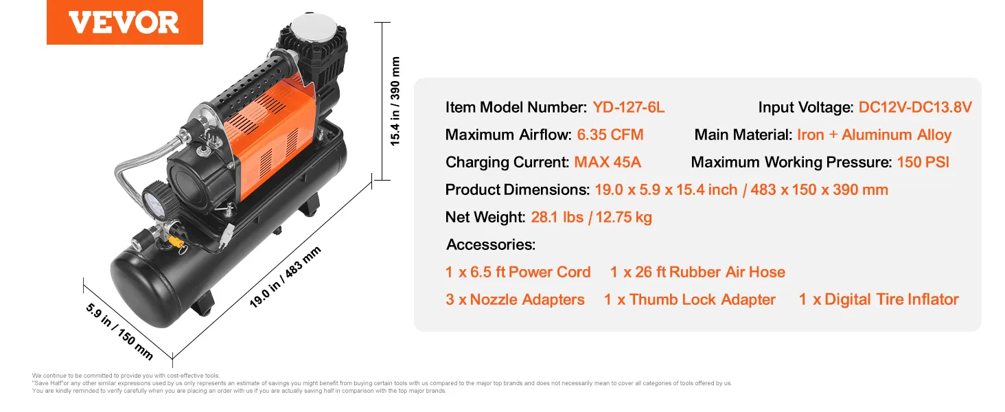 Fast Inflation with 6L Tank: The VEVOR 12V heavy-duty air compressor delivers a maximum pressure of 150 PSI and efficient airflow of 6.35 CFM, ensuring rapid tire inflation within minutes. Additionally, the large 6-liter air storage tank maintains constant air pressure without pulsation.