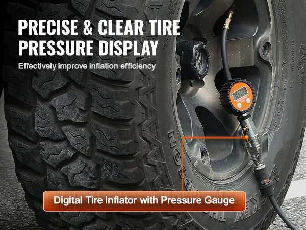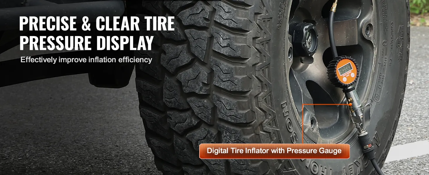Featuring a digital tire inflator with pressure gauge, you can simply hold the inflator trigger to start inflation and release it to stop. This enables efficient inflation and real-time pressure monitoring without the need to repeatedly turn on/off the air compressor switch.
