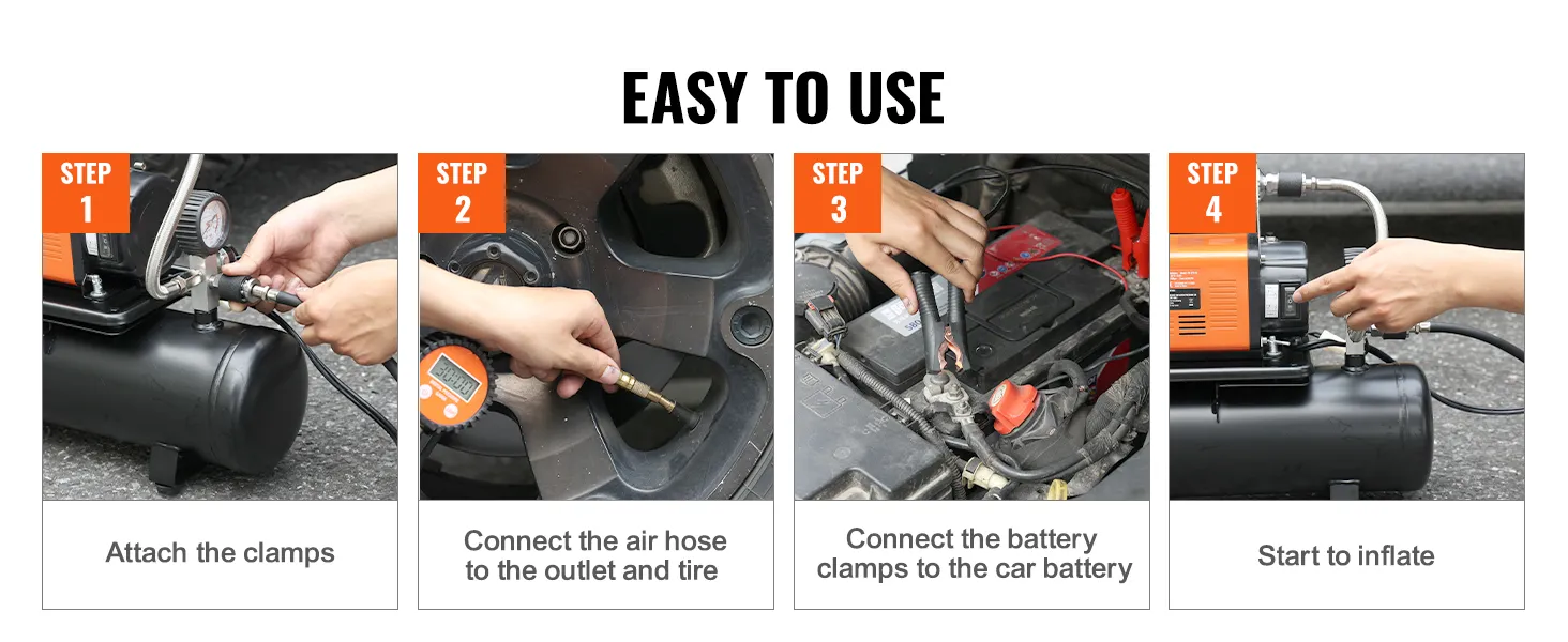 With a straightforward 4-step process — attach the clamps, connect the air hose to the air outlet and tire, attach the battery clamp to your vehicle's battery, and start inflation — completing your inflation tasks is effortless and hassle-free.