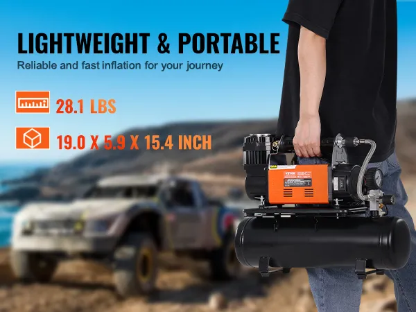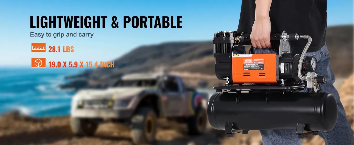 This offroad air compressor is lightweight and features a convenient handle, making it easy to carry and store in your vehicle's trunk or take with you on the go. Whether you're on a road trip or enjoying outdoor adventures, quick inflation is always at your fingertips.