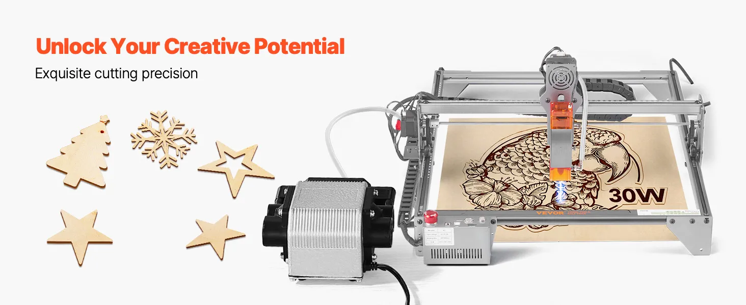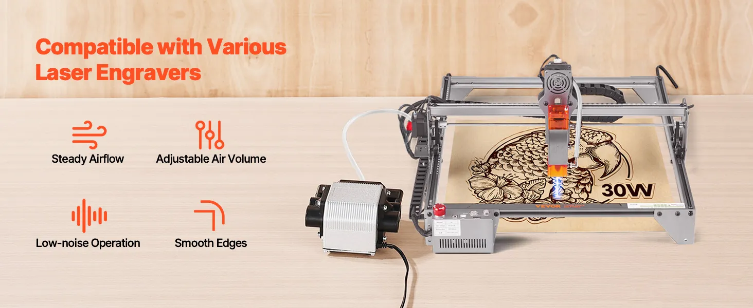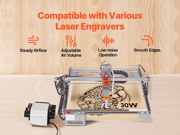 This air assist pump blows away smoke and debris with ease, extending the service life of your laser module. Adjustable 30L/min airflow reduces surface temperature, providing a clean cutting edge. Compatible with VEVOR and other brands laser engraver. Suitable for all your engraving works.